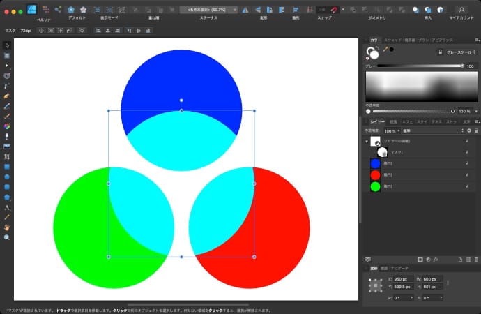 不透明度やグレーを使うと、マスクの濃度調整ができます。