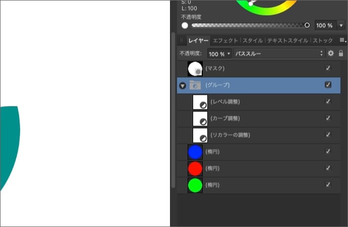グループレイヤーのプレビュー部分にシェイプをドラッグすると、複数の調整レイヤーをまとめてマスクできます。