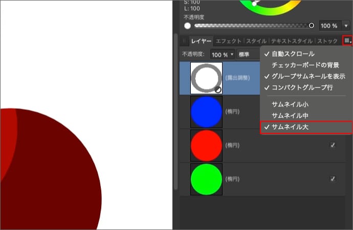 レイヤーパネルのメニューからレイヤーのサムネイルを大にすると、多少見やすくなります。