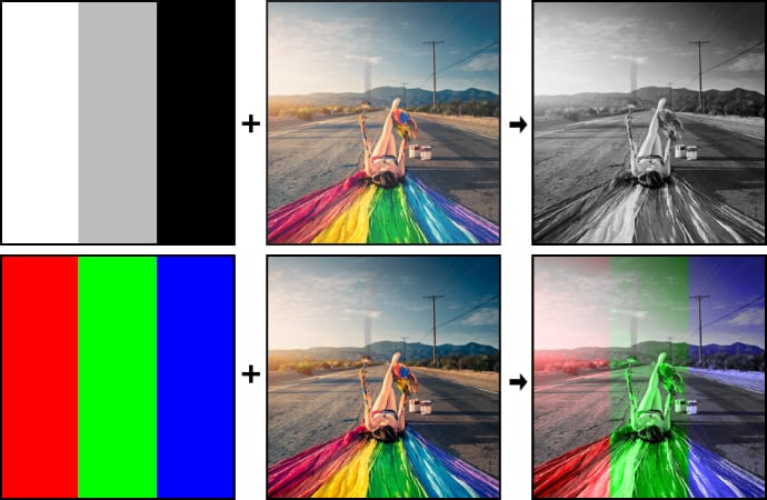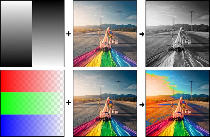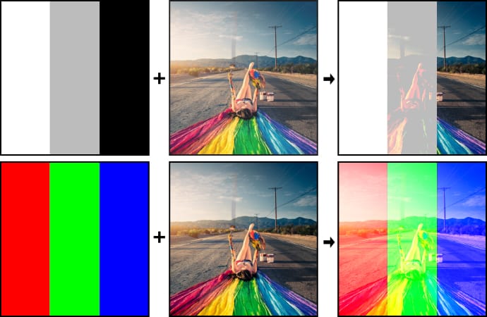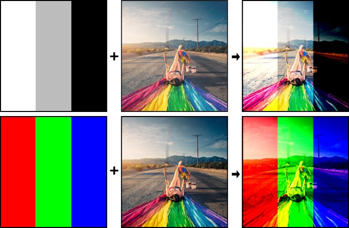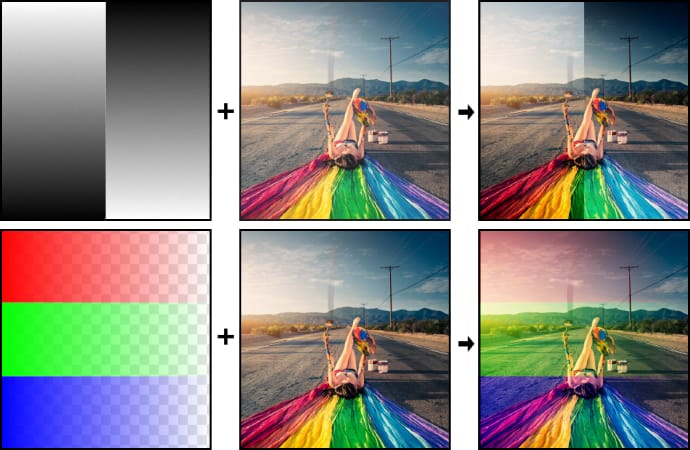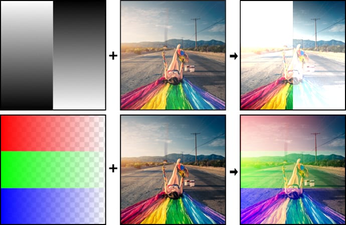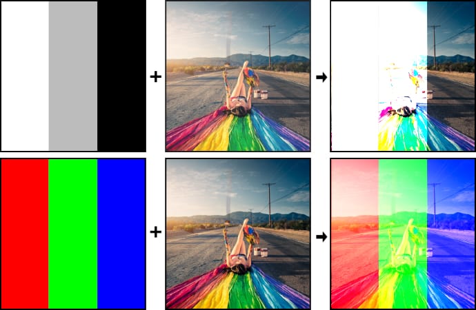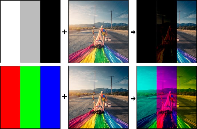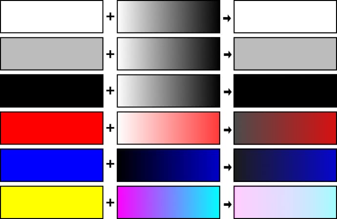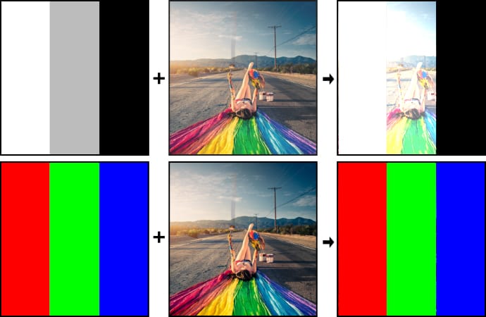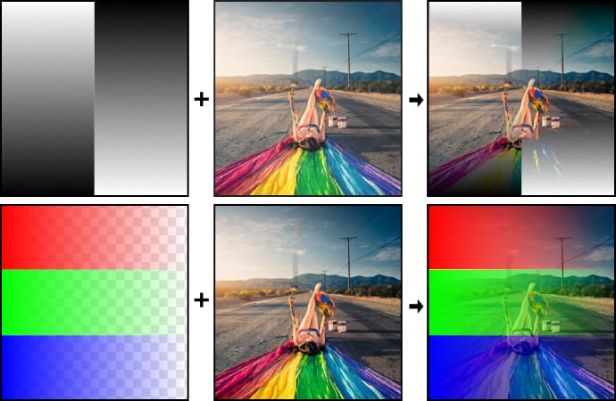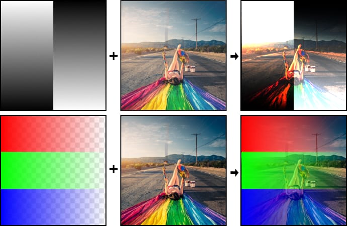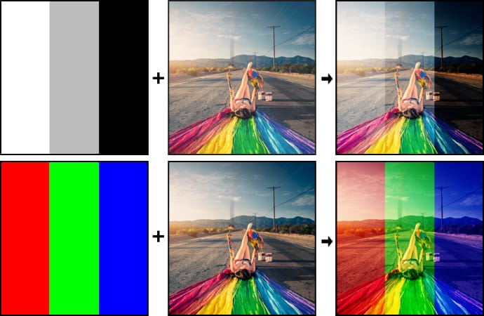 色の混ぜ方によってブレンドモードの種類が分かれていて、レイヤーにブレンドモードの種類を指定すると、レイヤーが重なった部分の色が種類に応じて変化します。