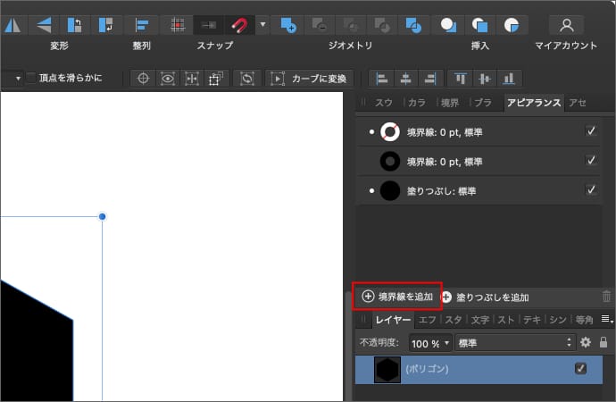 対象のレイヤーを選択している状態でアピアランスパネル(前のバージョンでは外観パネル)を開きます。