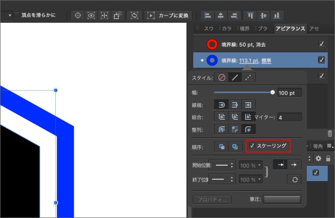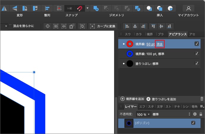 アピアランスパネルで、上側かつ内側にある境界線のブレンドモードを消去にします。
