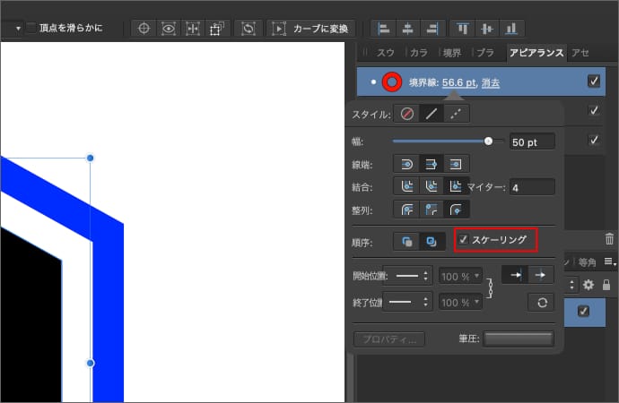 レイヤーを拡大、縮小した時に、境界線や隙間の太さも連動させる場合は、境界線の設定でスケーリングにチェックを入れます。