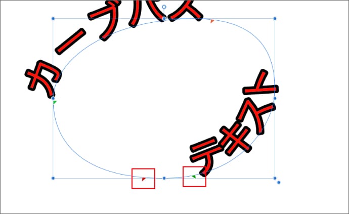 カーブパステキストをテキストツールで選択すると、カーブ上の文字の位置を調整するためのマークが表示されます。