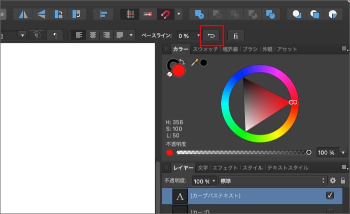 文字の向きを逆にしたい場合は、カーブパステキストを選択している状態で、コンテキストツールバーの「テキストパスの反転」をクリックします。