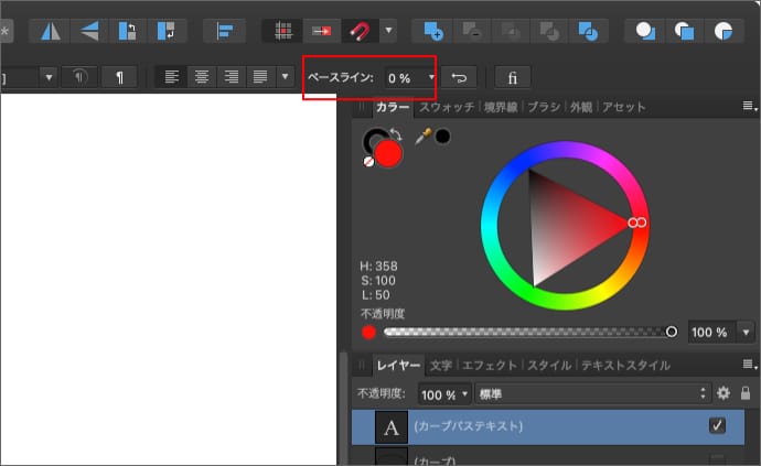 また、文字のカーブの外側や内側に並べたい場合は、カーブパステキストを選択している状態で、コンテキストツールバーの「ベースライン」を調整します。
