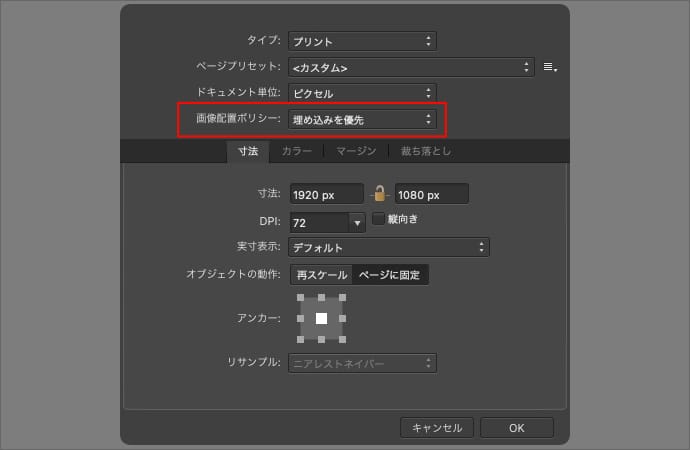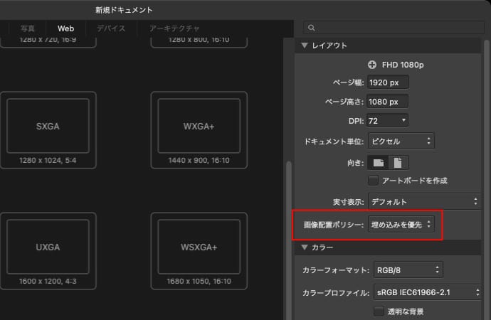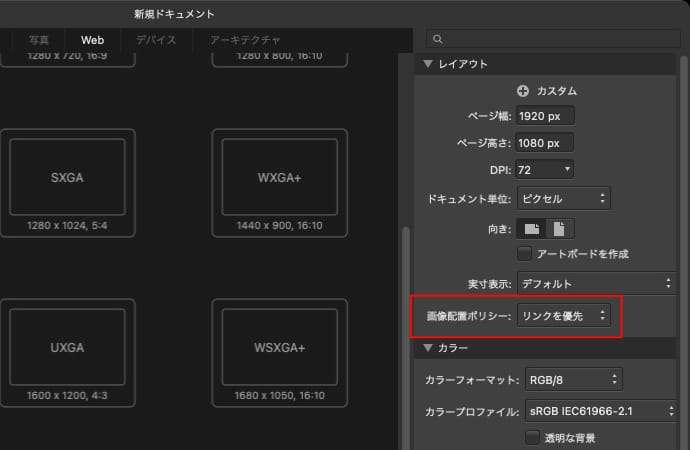 画像配置ポリシーを「埋め込みを優先」か「リンクを優先」に切り替えれば、次から画像レイヤーを作成した時の配置方法が切り替わります。