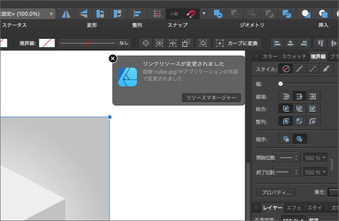 リンクの場合、Affinity Designerでドキュメントを編集中に元の画像が変更されると、変更されたことを知らせる通知が表示されます。