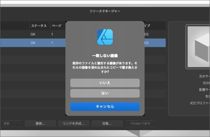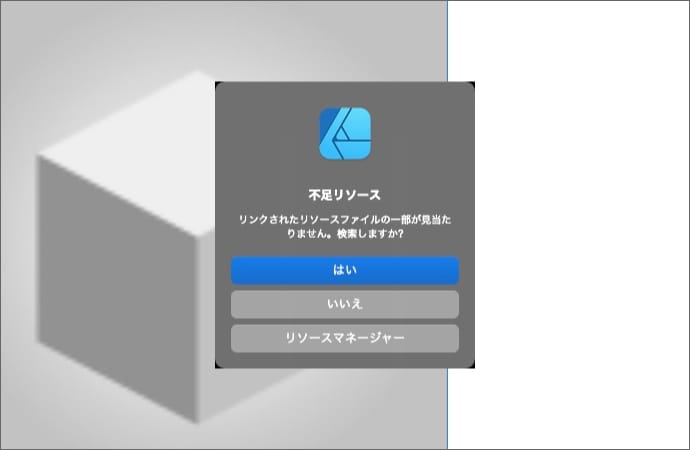 元のファイルを削除した場合は、ドキュメントを開き直すと不足リソースのメッセージが表示されます。