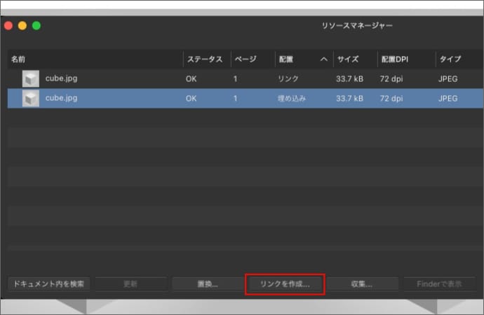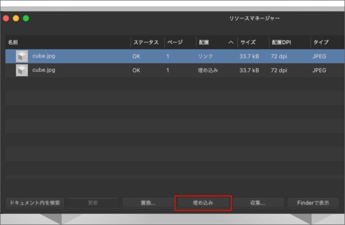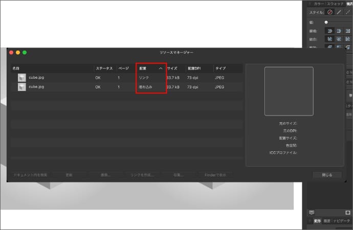 リソースマネージャーには、ドキュメント内に存在する画像レイヤーの一覧が表示され、配置の列に埋め込みかリンクのどちらかが表示されます。