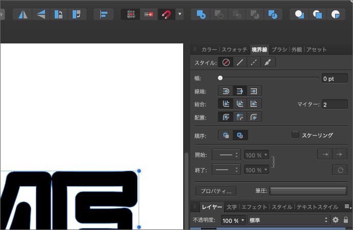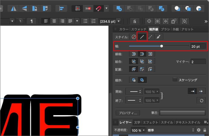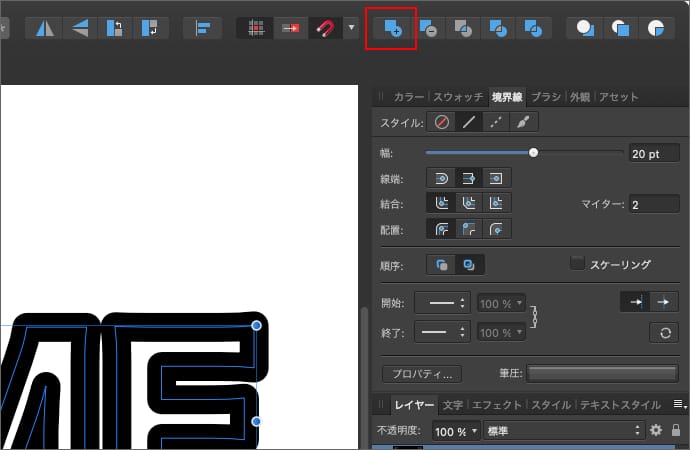 すると、文字の形のカーブが文字の境界線の形のカーブに変わります。