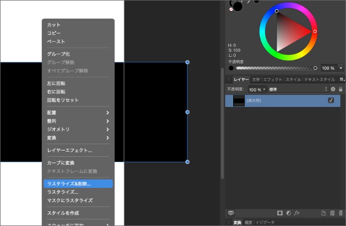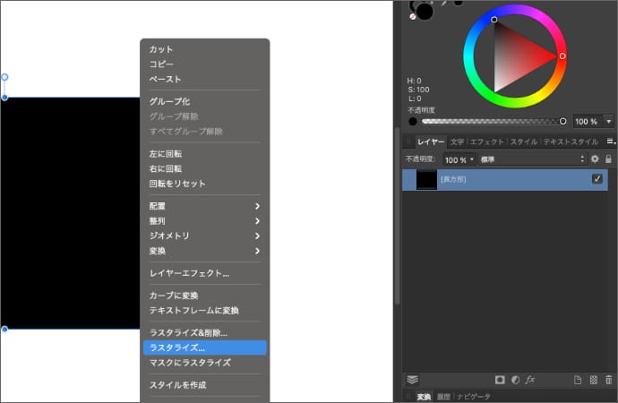 文字や図形、カーブなどのベクトルレイヤーや、画像レイヤーを右クリックして「ラスタライズ」をクリックします。![]()