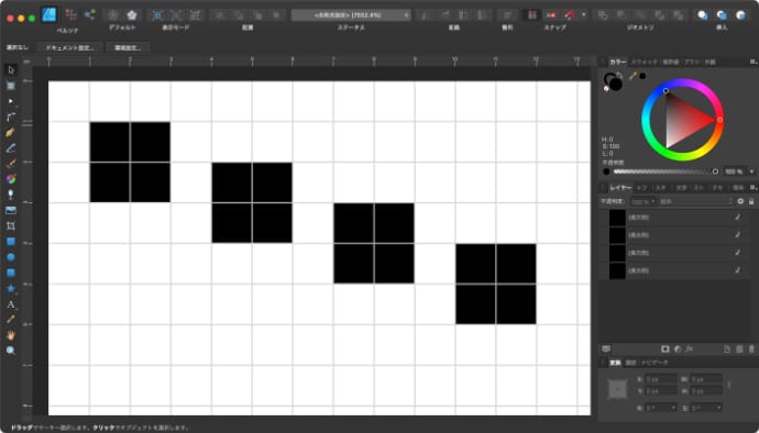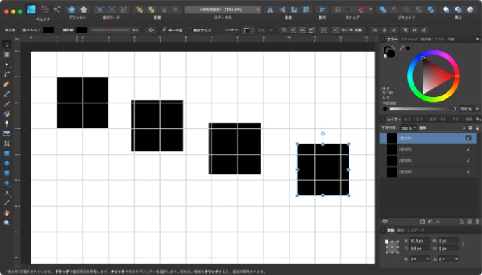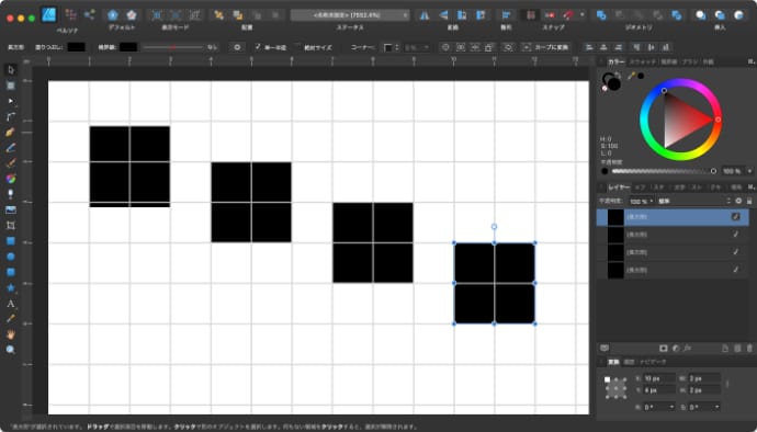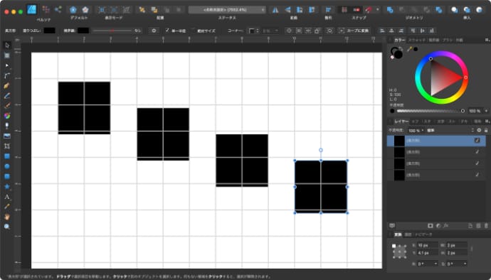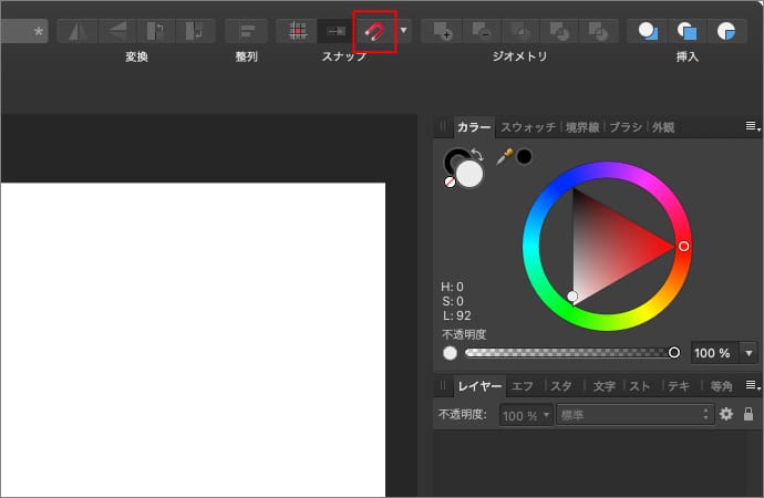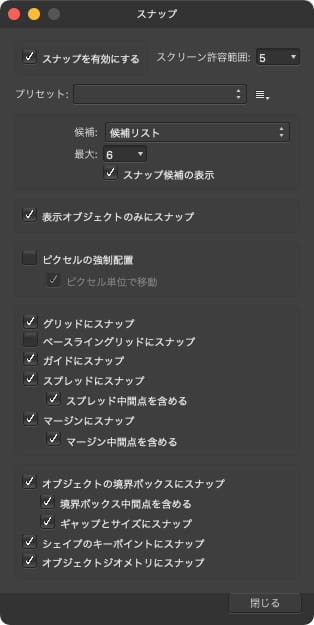 スナップする対象物が大量にあると、やたらスナップするだけでなく、Affinity Designerの動きも重くなるので、Affinity Designerの動きが重く感じた時はスナップの設定を見直すと改善するかもしれません。