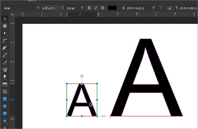 「シェイプのキーポイントにスナップ」を有効にすると、レイヤー全体や頂点をドラッグした時に、文字と図形のポイントにスナップします。
