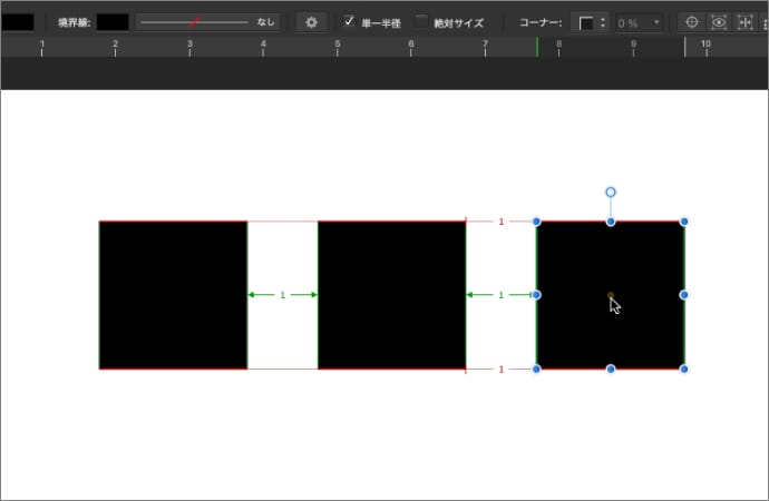 「ギャップとサイズにスナップ」を有効にすると、オブジェクト間の距離とオブジェクトのサイズにスナップします。