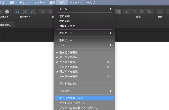 スナップの設定画面の位置を動かしたい場合は、メニューの表示から「スナップマネージャー」をクリックすると、動かせる設定画面が開きます。