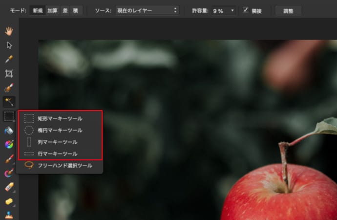 それぞれ作れる形が違う、短形マーキーツール、楕円マーキーツール、列マーキーツール、行マーキーツールがあります。