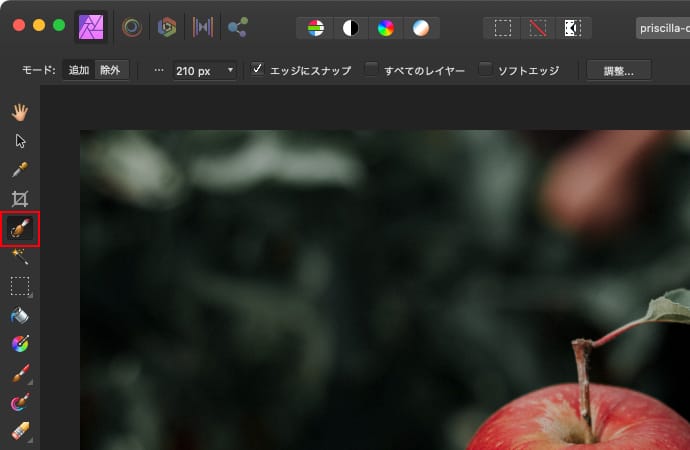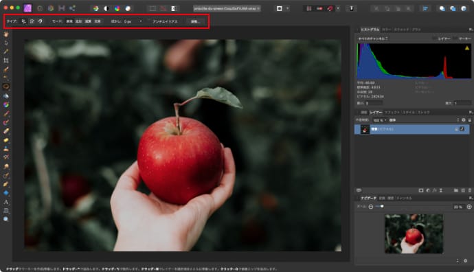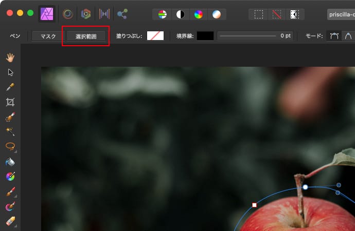 Mac版のAffinity Photoで写真を一部だけ加工したり、写真の一部を切り抜きくために、写真の特定の一部分だけを選択する方法について解説します。
