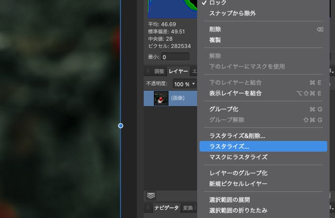 その場合は、レイヤーを右クリックして「ラスタライズ」をクリックします。