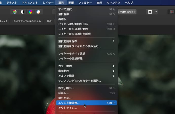 メニューの選択の「エッジを微調整」をクリックすると、調整画面が表示されます。