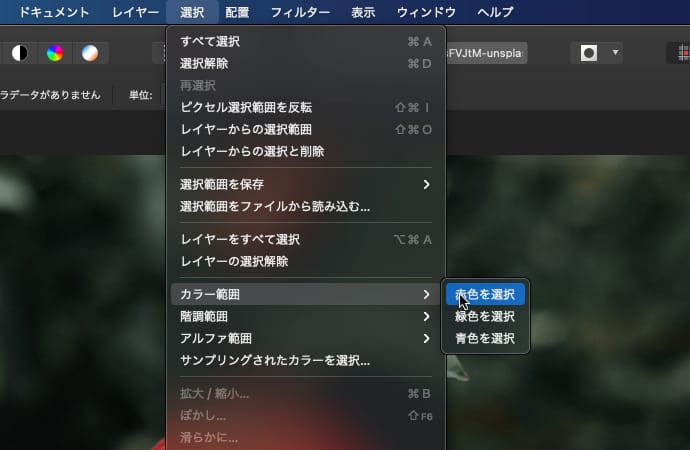 メニューの選択のカラー範囲から「赤色を選択」「緑色を選択」「青色を選択」をクリックすると、その色のピクセルが選択されます。