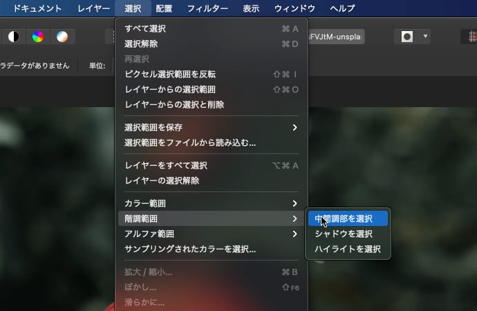 メニューの選択の階調範囲から「中間調部を選択」「シャドウを選択」「ハイライトを選択」をクリックすると、その明るさのピクセルが選択されます。