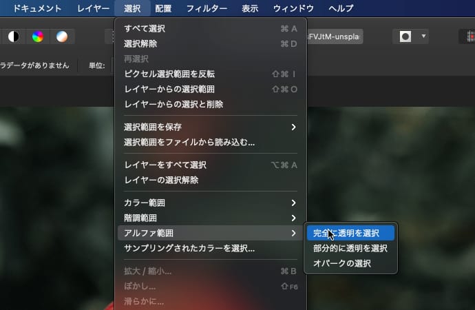 メニューの選択のアルファ範囲から「完全に透明を選択」「部分的に透明を選択」「オパーク(不透明)の選択」をクリックすると、その透明度のピクセルが選択されます。