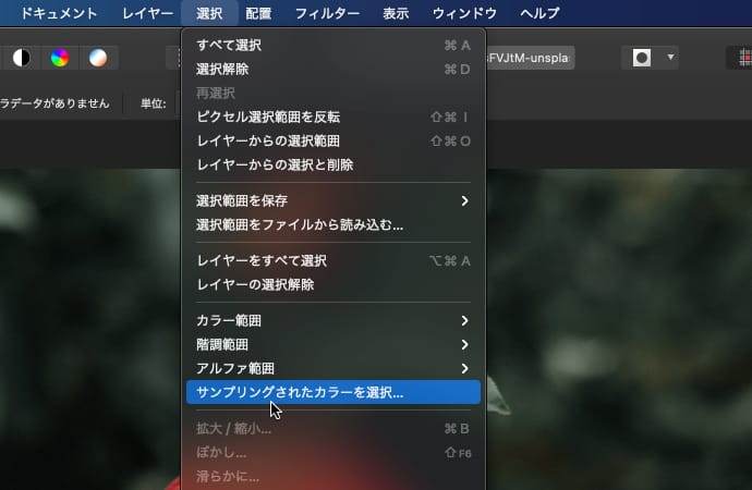 メニューの選択のサンプリングされたカラーを選択をクリックすると、サンプルカラーが選択できるようになります。