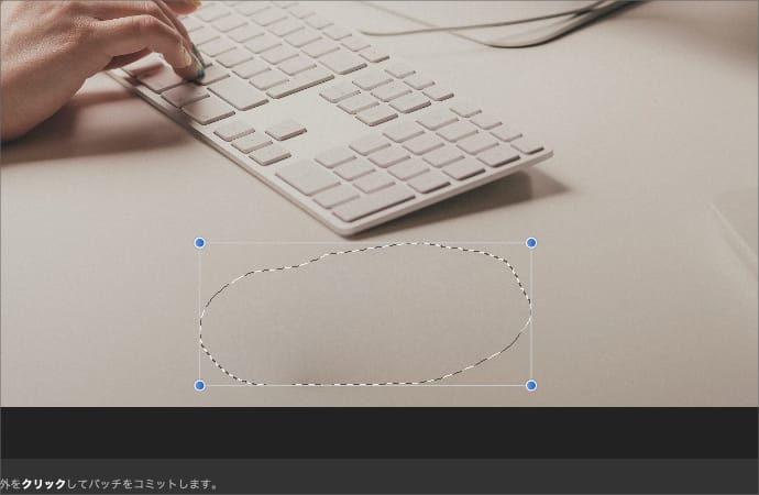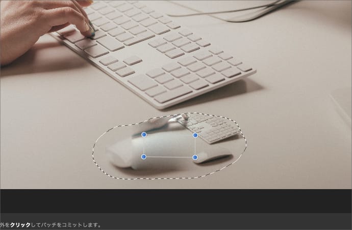 コンテキストツールバーでパッチツールの選択方法や置き換え方の調整ができます。