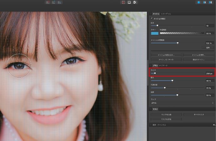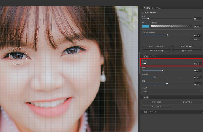 スタジオのブラシでサイズを調整して、目がちょうど入るぐらいの大きさにします。