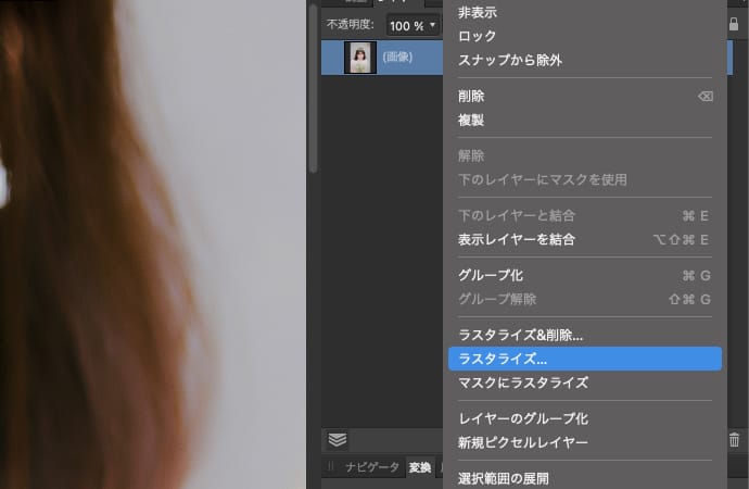 画像レイヤーの場合は、レイヤーを右クリックしてラスタライズをクリックします。