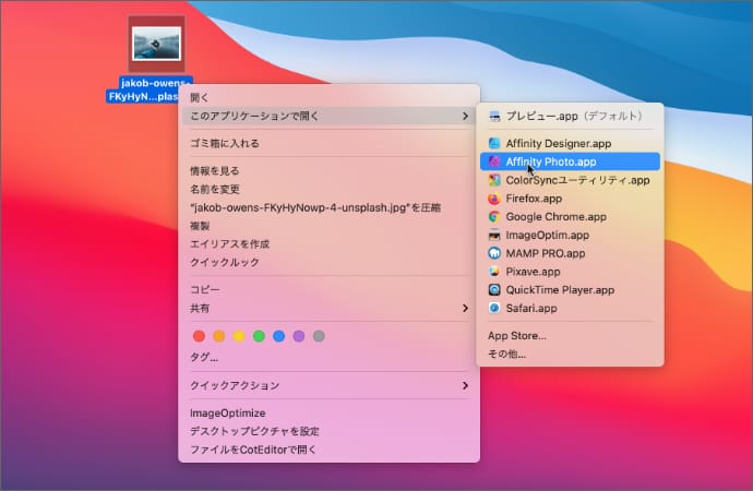 デフォルトアプリケーションじゃない場合は、ファイルを右クリックして、このアプリケーションで開くからAffinity Photoを選択することもできます。