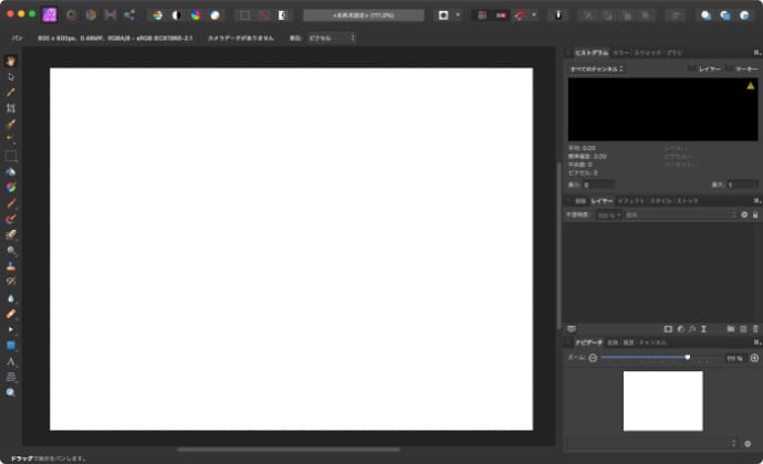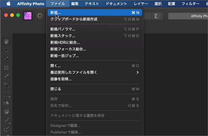Affinity Photoを起動してからメニューのファイル→新規をクリックすることで、既存の画像ファイルからスタートせずに、まっさらな状態から始めることもできます。
