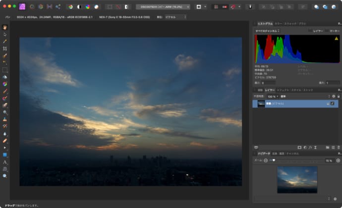 Affinity Photoを使って写真を加工する場合は、元のJPEGなどはそのまま残しつつ、加工後は、Affinity Photoのドキュメント形式で保存した上で画像を書き出すという流れがいいと思います。