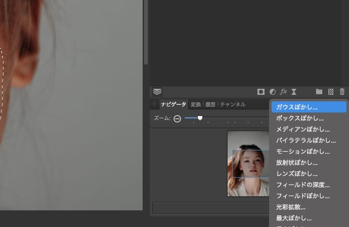 インペインティングブラシツールだけでも十分だと思いますが、さらに全体的に肌質を滑らかにしたい場合は、ガウスぼかしフィルターを使います。