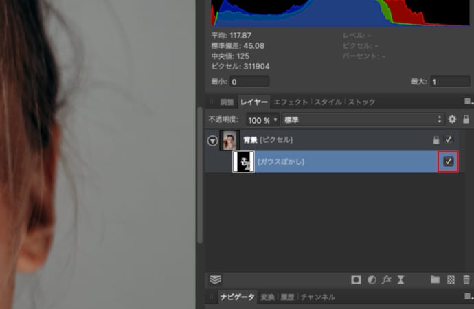 フィルターのかかり具合をチェックしたい場合は、レイヤーのガウスぼかしのチェックを外すと、フィルターを無効にできます。
