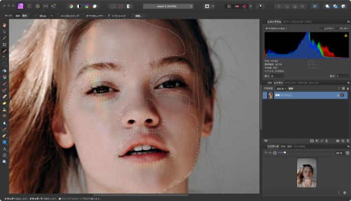 Mac版のAffinity Photoで写真を一部だけ加工したり、写真の一部を切り抜きくために、写真の特定の一部分だけを選択する方法について解説します。