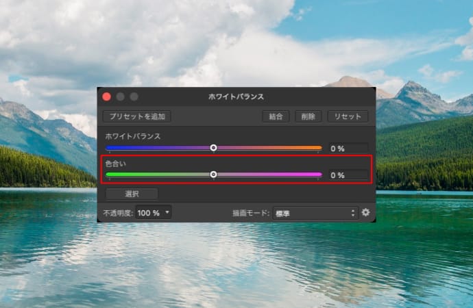 色合いのスライダーは、左右に動かすことでマゼンタか緑の色合いを付けることができるので、色の変化を補正することができます。