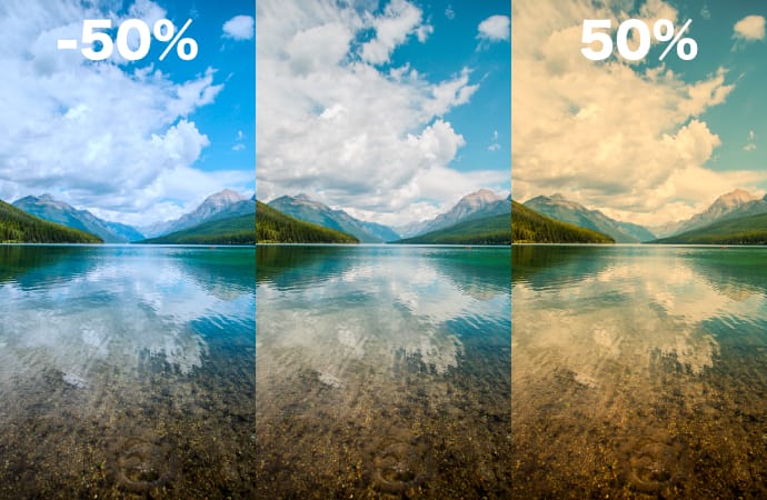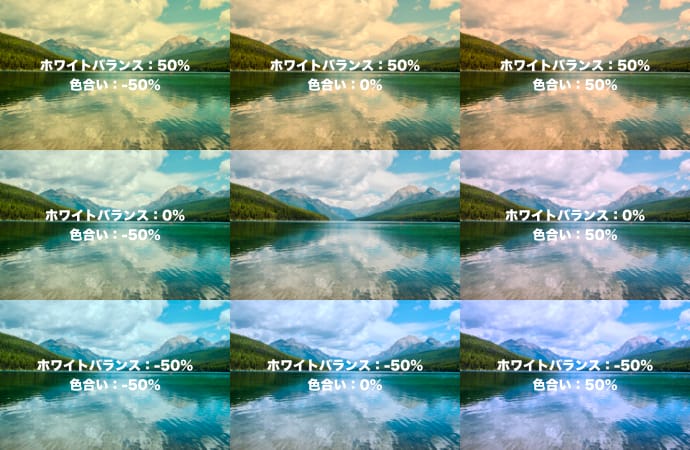 スライダーを左に動かすと色温度が下がって青っぽくなり、右に動かすと色温度が上がって赤っぽくなります。