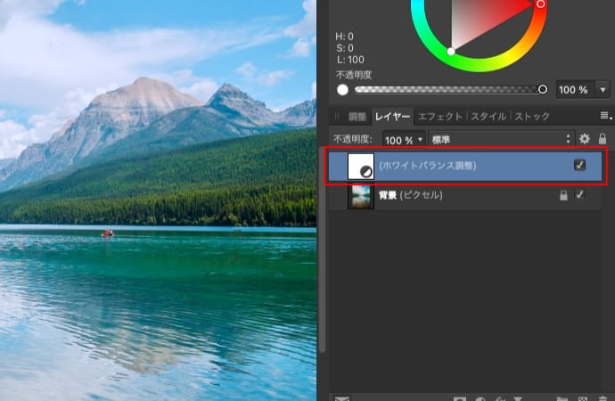 調整レイヤーで変更したホワイトバランスは、値をリセットするか、調整レイヤーを削除するか、調整レイヤーを非表示にすれば元に戻ります。