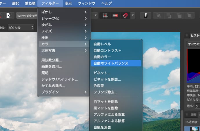 メニューのフィルターにあるカラーから、自動ホワイトバランスを選択します。