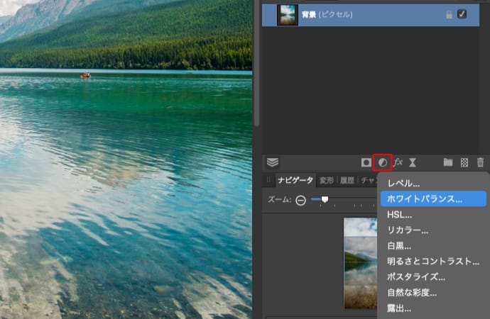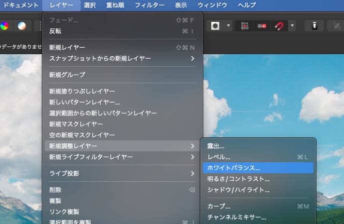あるいは、メニューのレイヤーにある新規調整レイヤーのホワイトバランスを選択しても同じです。