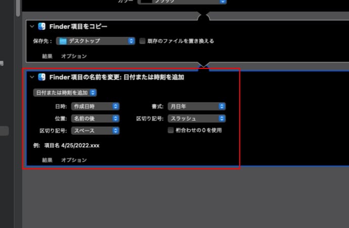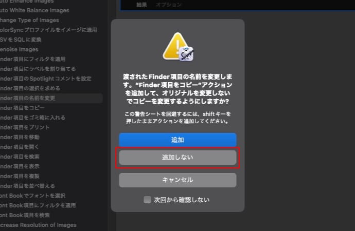 「渡されたFinder項目の名前を変更します。"Finder項目をコピー"アクションを追加して、オリジナルを変更しないでコピーを変更するようにしますか?」というメッセージが表示される場合は「追加しない」を選択します。