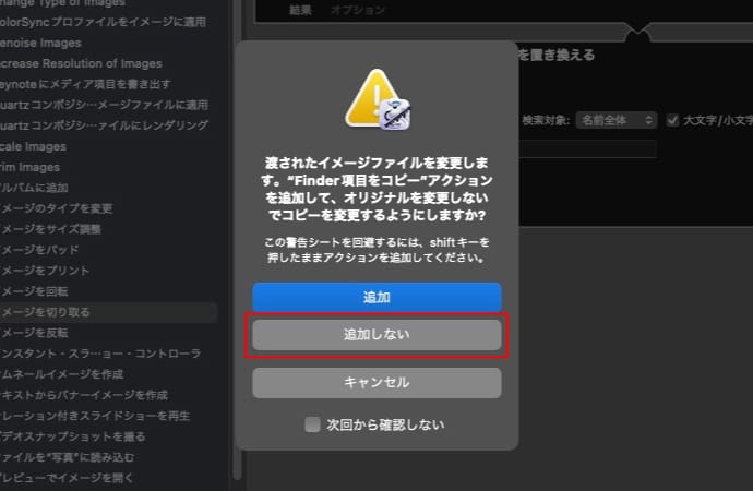 「渡されたイメージファイルを変更します。"Finder項目をコピー"アクションを追加して、オリジナルを変更しないでコピーを変更するようにしますか?」というメッセージが表示される場合は、「追加しない」を選択します。