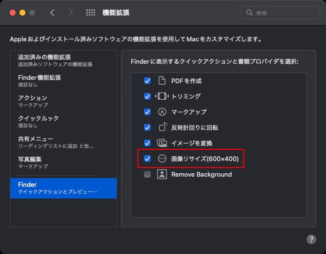 システム環境設定の機能拡張にあるFinderの中に、先ほど作ったクイックアクションが追加されてますので、チェックが入っていない場合はチェックを入れてください。