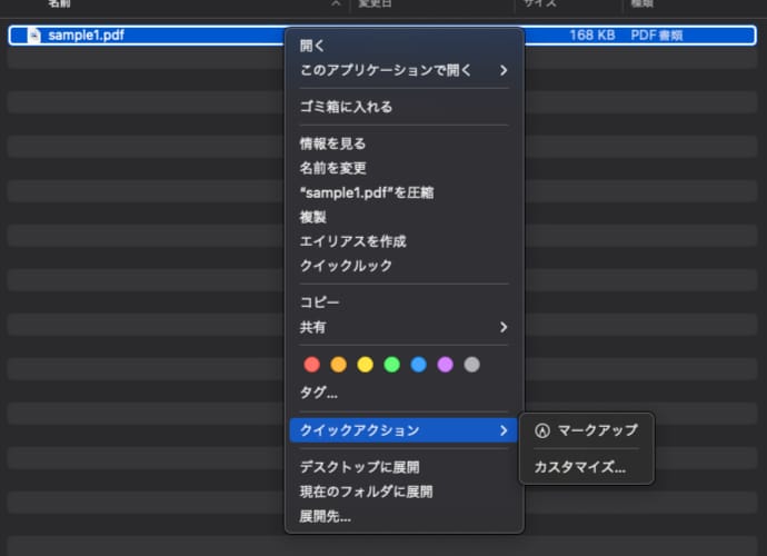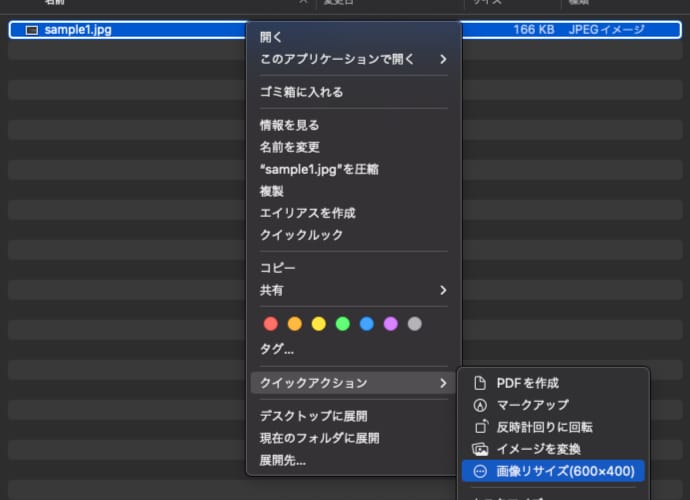 画像ファイルを右クリックすると、クイックアクションの中に自作したAutomatorのクイックアクションが選択できるようになります。