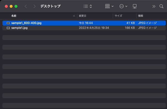 実行すると、Automatorで設定した場所と名前でリサイズされた画像が生成されます。
