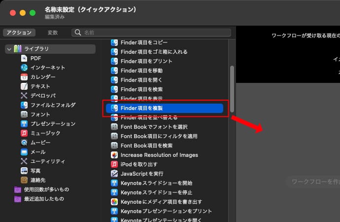画面左側のアクションのライブラリにある「Finder項目を複製」をワークフローにドラッグして追加します。