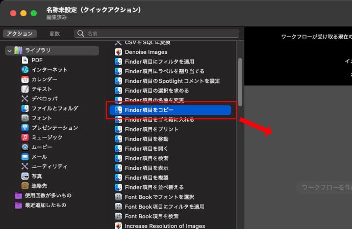 画面左側のアクションのライブラリにある「Finder項目をコピー」をワークフローにドラッグして追加します。
