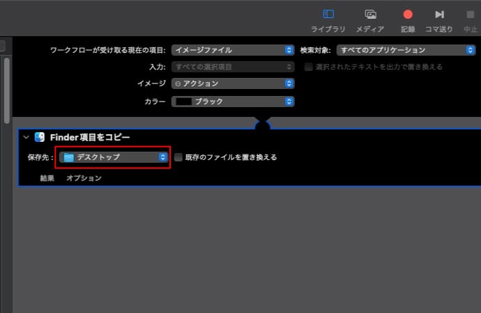 複製したファイルの保存場所を、元の画像ファイルと同じ場所にするか、特定の決まったフォルダにするかで、Automatorのワークフローに使うアクションの種類が変わります。